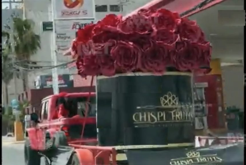 Junto al monumental ramo viajaba una lona que identificaba el origen del detallazo: Chispi Fruit, negocio de florería responsable de semejante despliegue floral que bien podría competir con un carro alegórico.